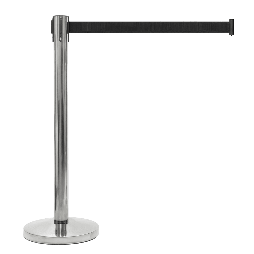 Poteau de balisage en acier inoxydable chromé avec ruban rétractable noir – 2 mètres